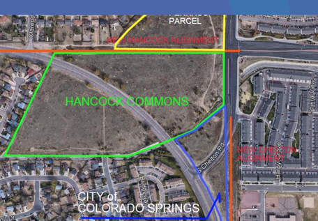 Location: The Hancock Commons Urban Renewal Area is comprised of one parcel on approximately 25.01 acres of land. The boundaries of the Plan Area to which this Plan applies is divided by Hancock Expressway with Chelton Road to the east, Clarendon Drive to the west.