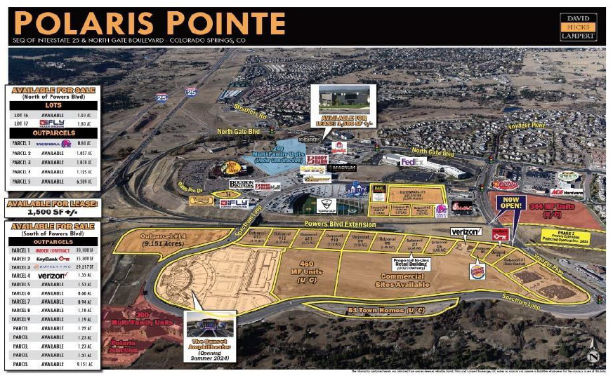 Plan Goals: Based on current market studies and the City of Colorado Springs’ Comprehensive and Long- Range Transportation plans; the specific development objective for the Plan is to construct the remaining segment of Powers Boulevard (a 4-lane expressway) from State Highway 83 to Interstate 25. The primary component of the development will include approximately 640,000 sf upscale retail space. Other proposed uses include restaurant, office, hotel, mixed-use and entertainment. The name change from Copper Ridge to Polaris Pointe was initiated by the USAFA.