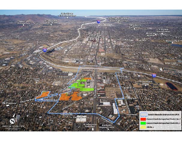 There are four Silos – development areas – in the South Nevada Avenue Urban Renewal Area.  The Silos are defined by ownership structure and development/redevelopment status.  The four Silos total approximately 99 acres.